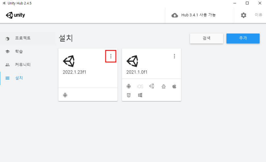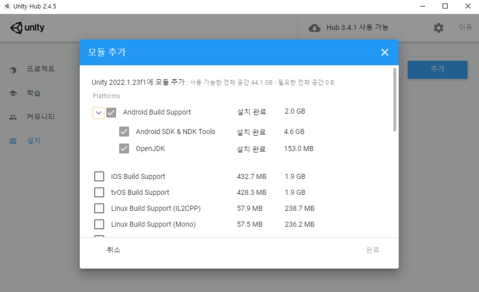 적용이 안되어있으면 유니티 허브에서 모듈 추가를 통해 다운받을 수 있다