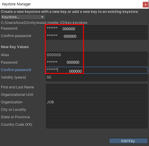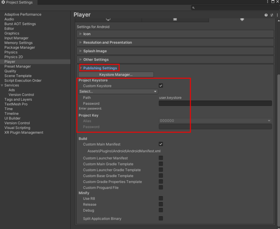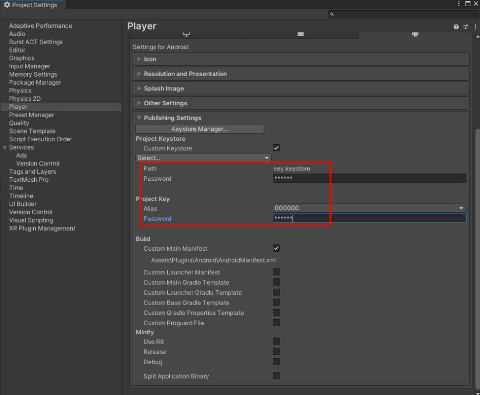 마지막으로 Publising Settings에서 Keystore을 만들어 password를 입력해준다