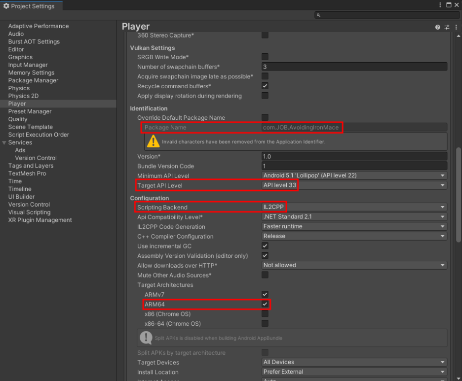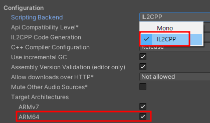ARM64가 비활성화 되어있다면 위에있는 Scripting Backend를 Mono에서 IL2CPP로 변경해준다