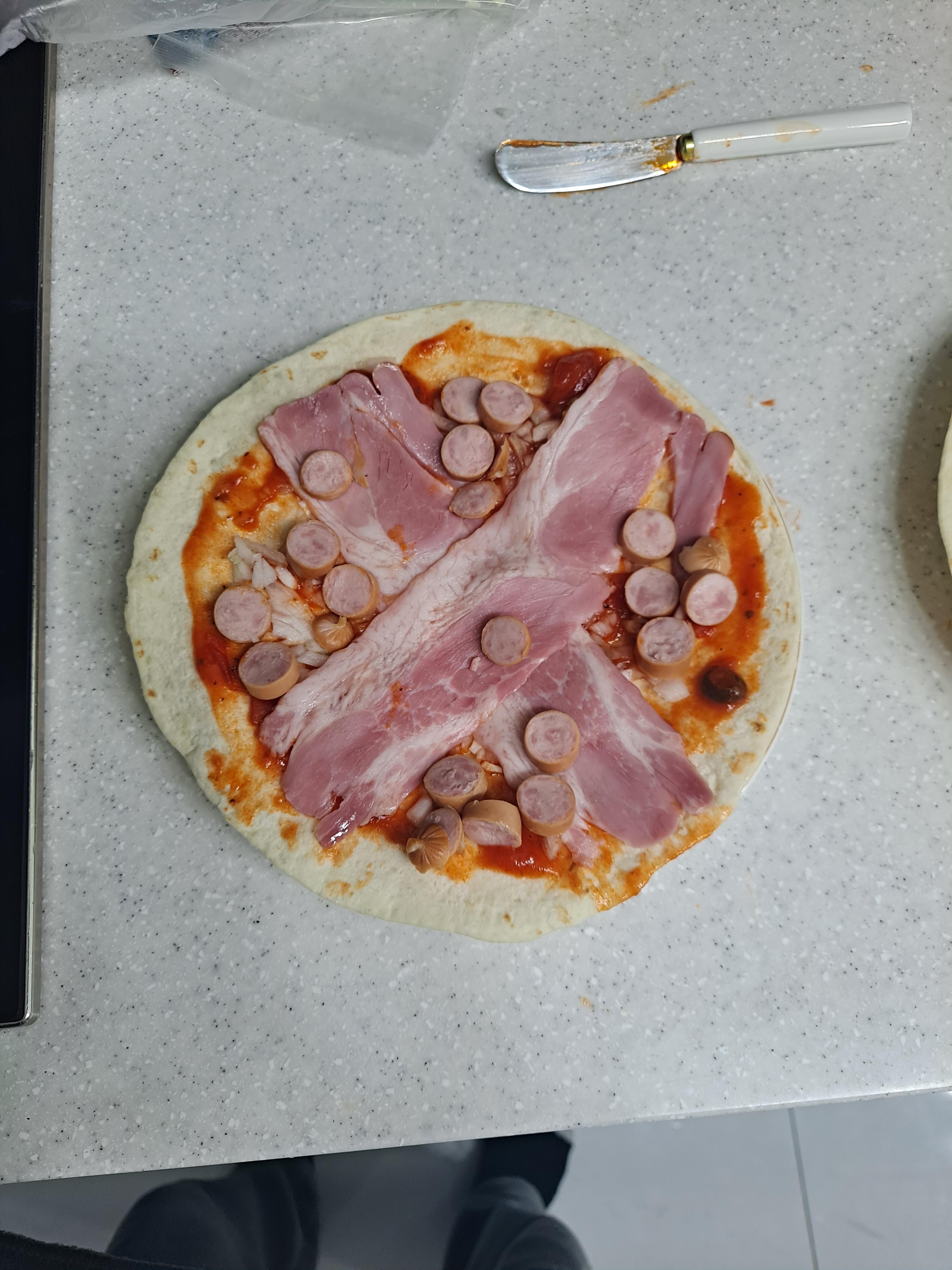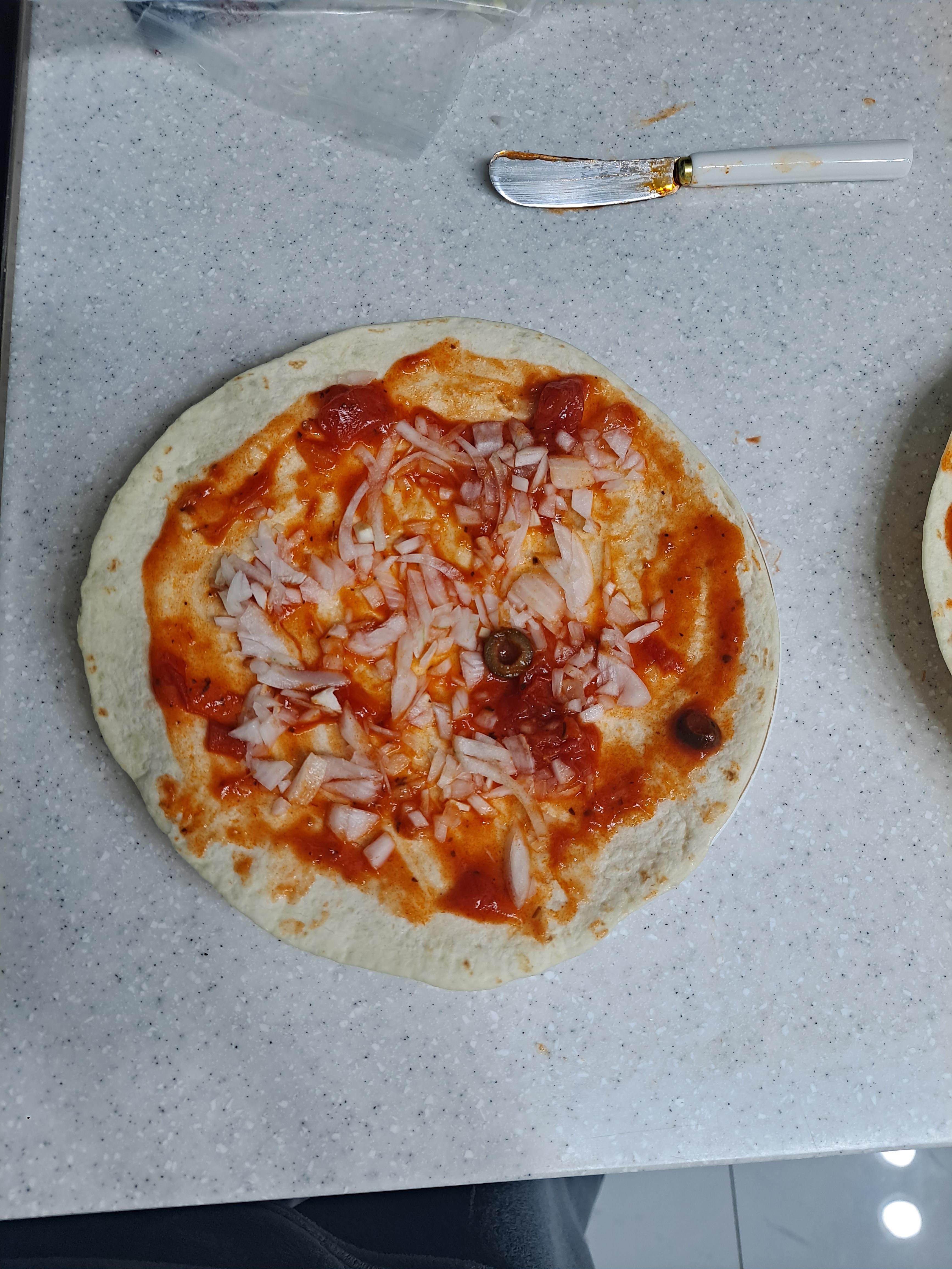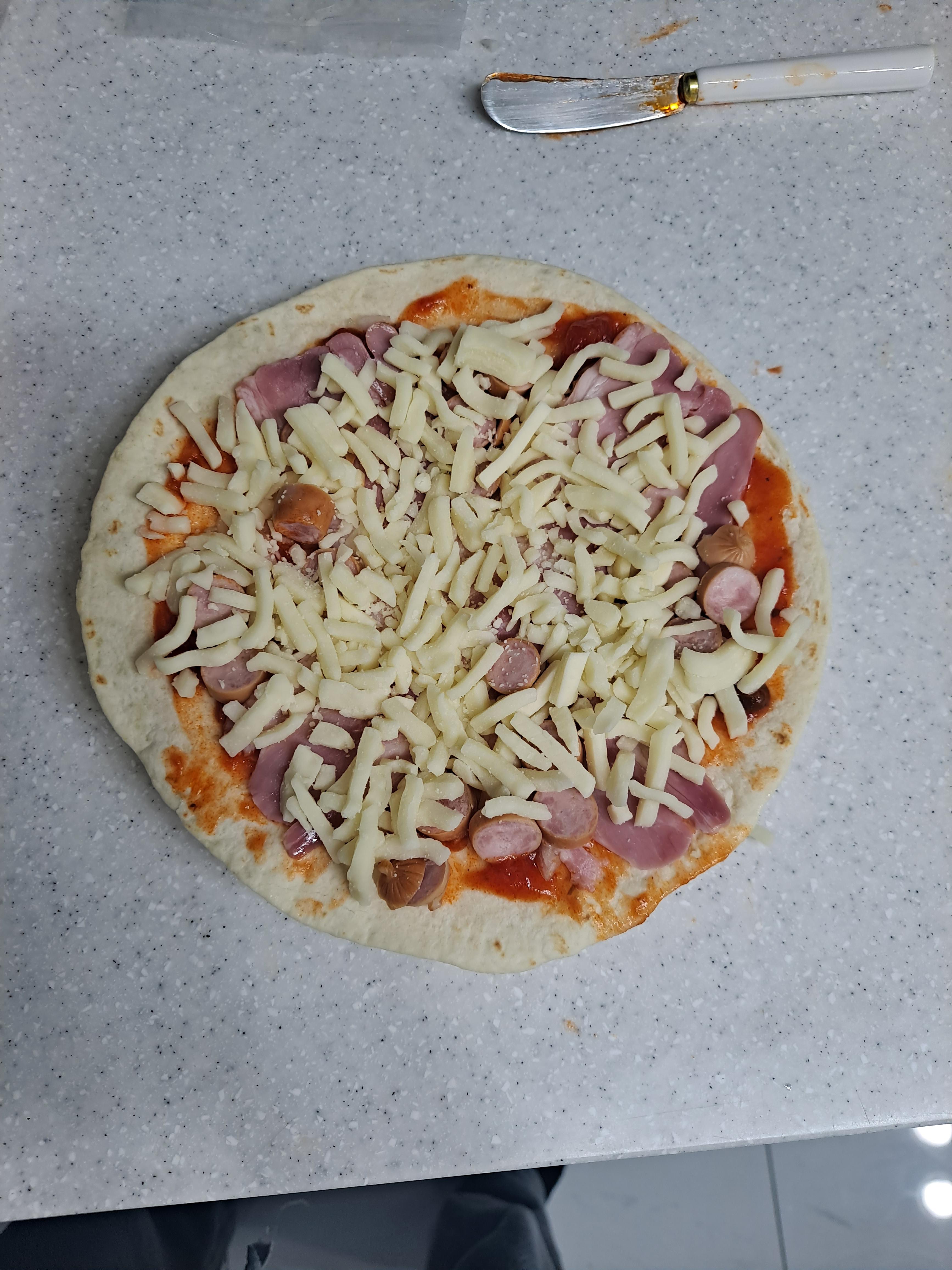 1.또띠아 위에 스파게티 소스를 넓게 펴 바른다.