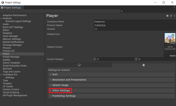 File → Bulid Settings → Player Settings에 들어가면 Other Settings가 있다
