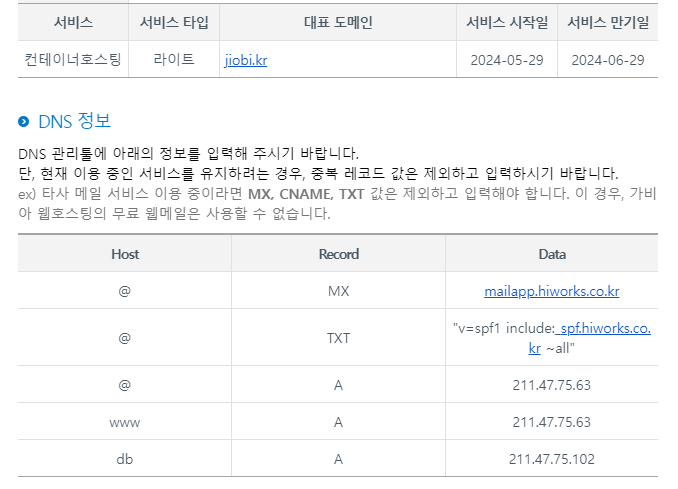 자동으로 세팅되지 않을 경우 이메일로 DNS정보가 발송됩니다.