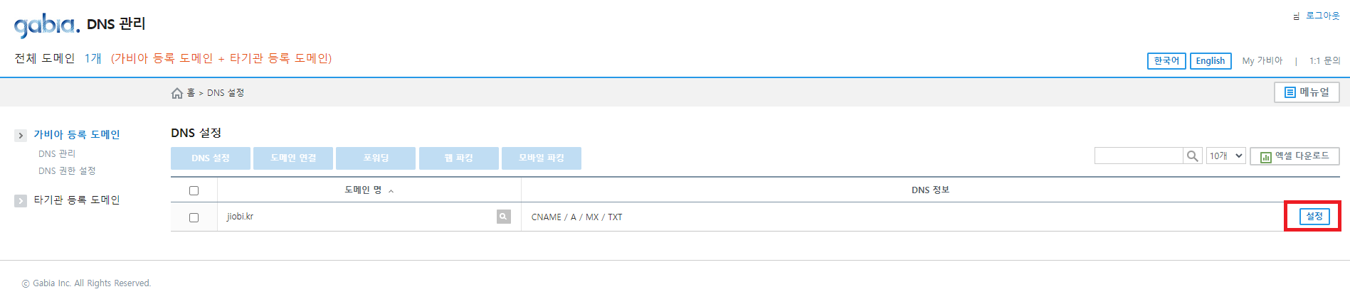 가비아 등록 도메인이고, 가비아 네임서버를 이용하는 경우에는 DNS설정이 자동으로 세팅되지만