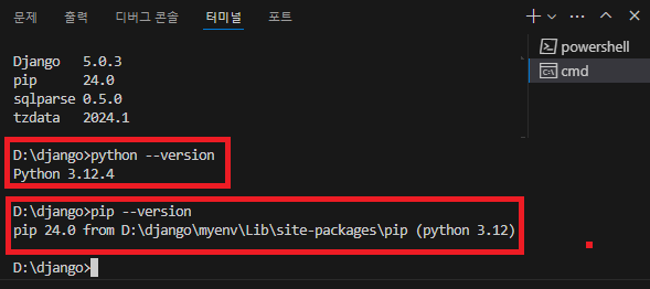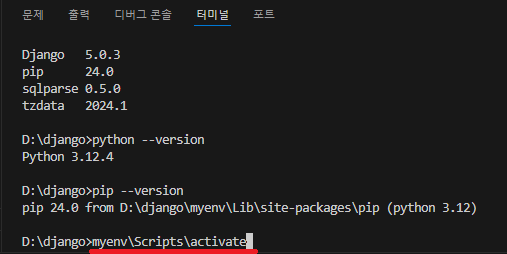 pip install django를 입력하면 최신버전이 설치됩니다