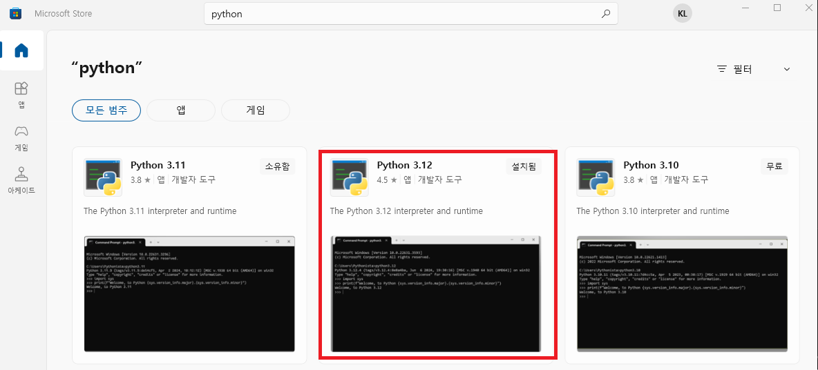 저는 Microsoft Store에서 python 3.12버전을 설치해줬습니다