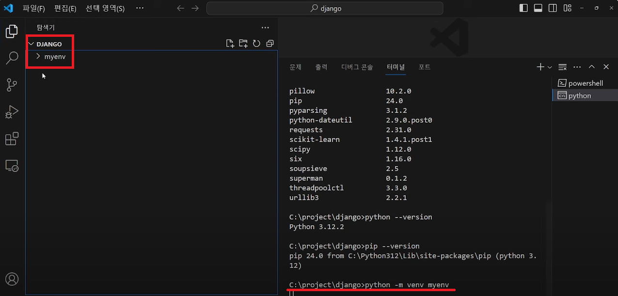 생성하면 장고폴더 아래에 가상환경이 생기는걸 볼 수 있습니다