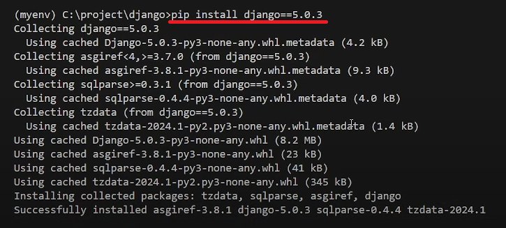 저는 5.0.3버전을 설치했기에 [ pip install django==5.0.3 ] 을 해줬습니다