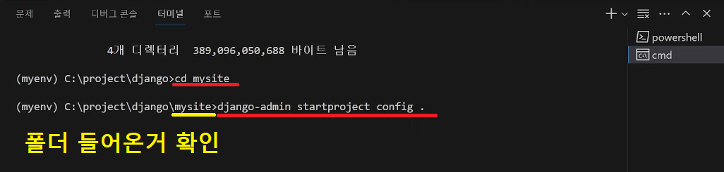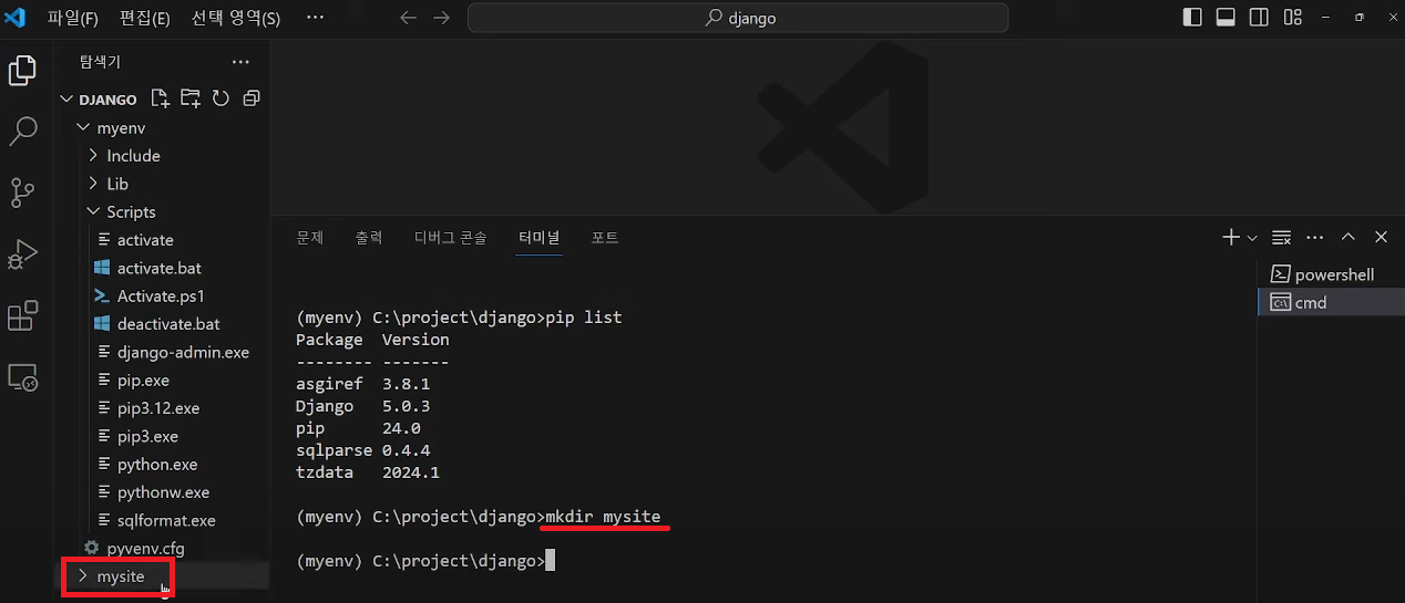 저는 mysite라는 폴더를 만들었기에 옆에 mysite 폴더가 생긴걸 확인할 수 있습니다