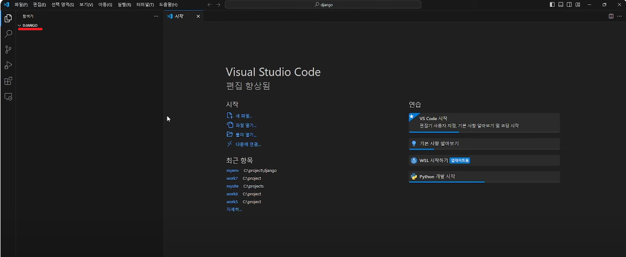 파일 → 폴더열기 django를 선택해줍니다