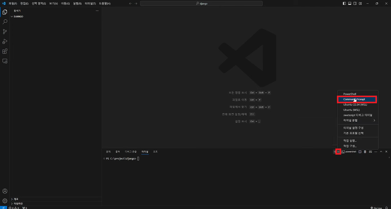 4. 터미널을 Command Prompt로 변경해줍니다