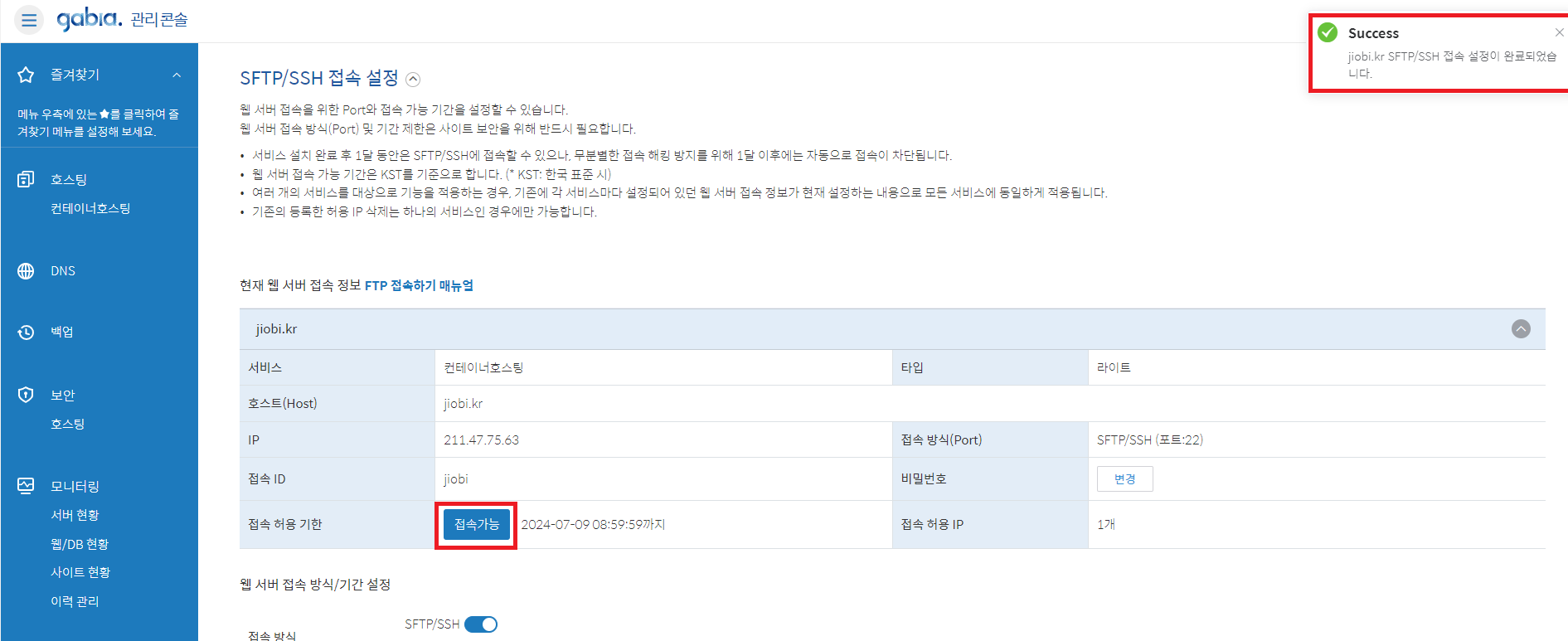 저장하면 이렇게 알림메세지와 접속가능으로 바뀐것을 확인 할 수 있습니다