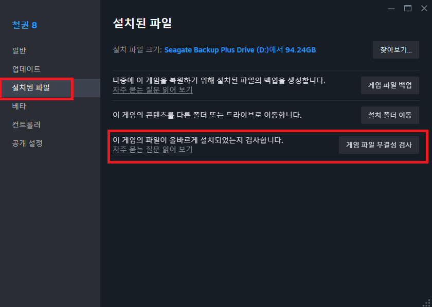 설치된 파일 → 게임 파일 무결성 검사를 했더니 자동으로 누락된 파일을 다운로드하며 해결되었습니다!
