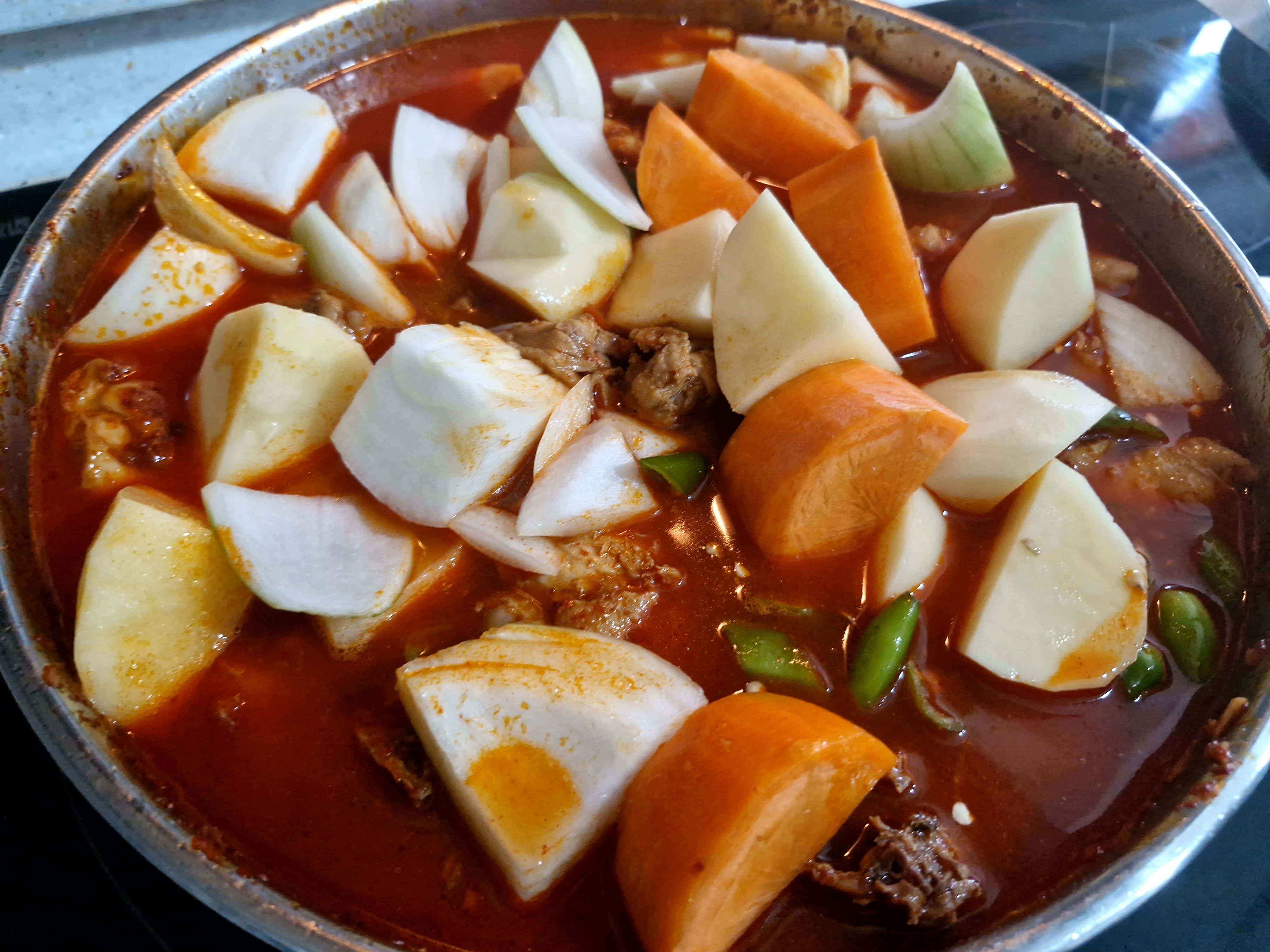 재료 : 닭1.6kg, 감자큰거 1개, 대파 2대, 양파큰거 1개, 물1리터, 청양고추 4개, 당근 반개