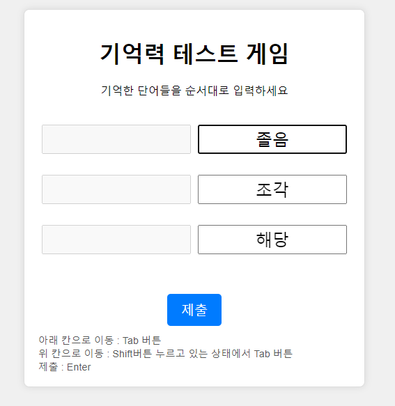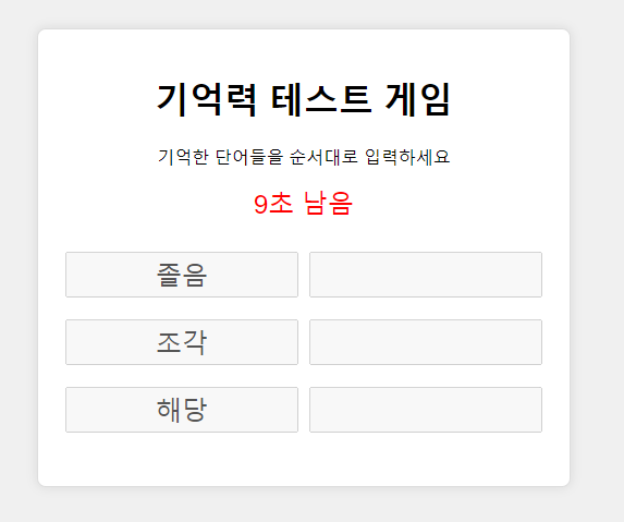 10초가 지나면 이제 오른쪽 칸에 알맞은 순서대로 단어를 입력해주세요!