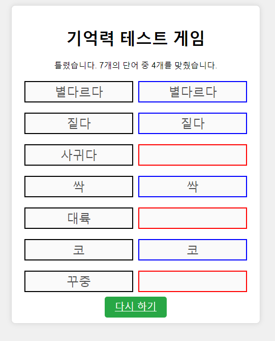 다 맞았다면 다음엔 단어가 1개씩 늘어나게 됩니다 (외울 수 있는 시간도 늘어나니 걱정하지 마세요!)
