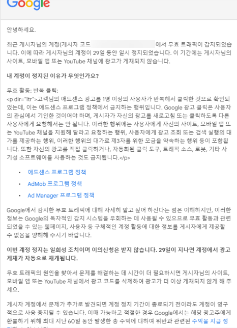 심지어 이번 계정 정지는 일회성 조치이며 이의신청은 받지 않습니다. 29일이 지나면 계정에서 광고 게재가 자동으로 재개됩니다. 라며 한달간 광고를 막고 이게 제 책임이라고 하는겁니다