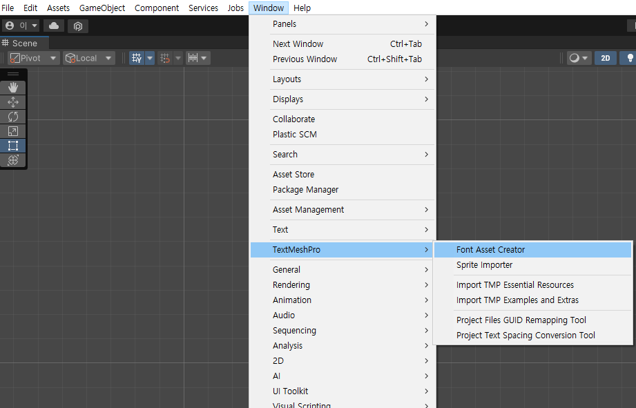 이제 유니티 상단에 있는 Window → TextMeshPro → Font Asset Creator 를 클릭해줍니다