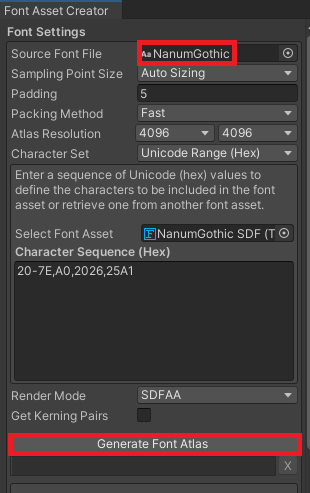 다시 돌아와서 위 칸에 TTF파일로 만들 폰트를 넣어주고 Generate Font Atlas를 눌러 만들어준다음