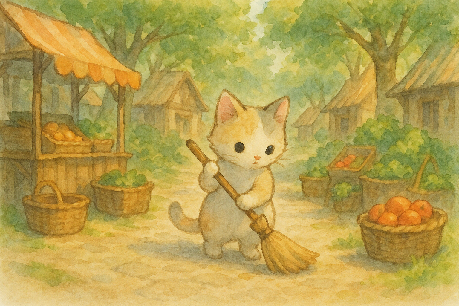 In a deep, lush forest village, there lived a cat named Miri, who had a gentle heart.