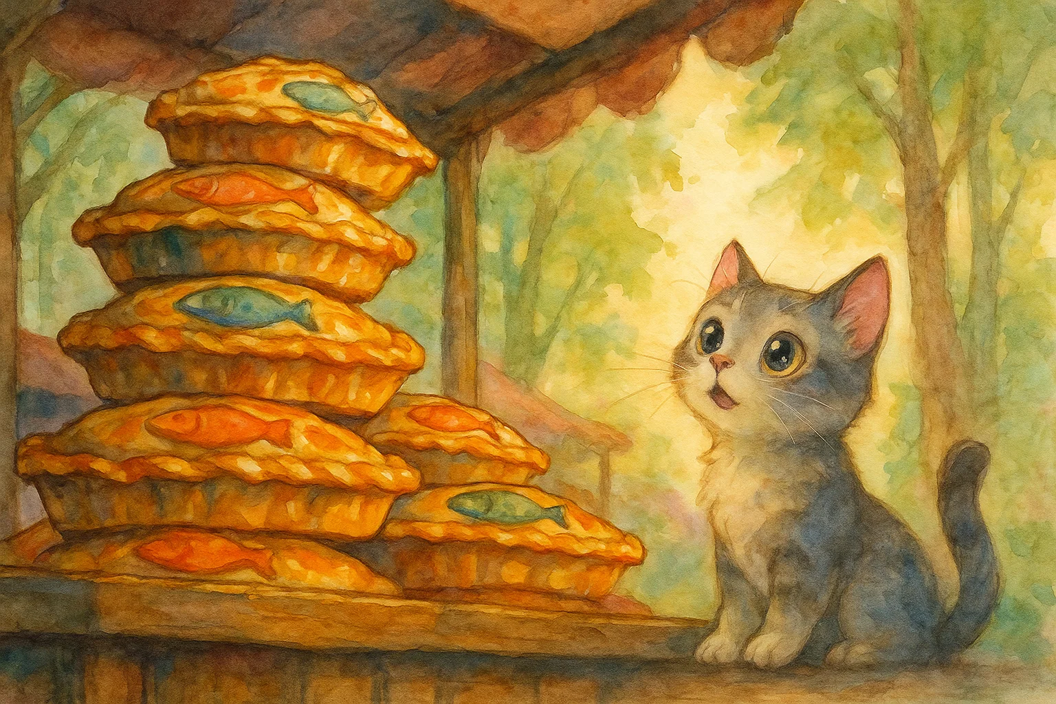 One day, the village market was filled with delicious fish pies.