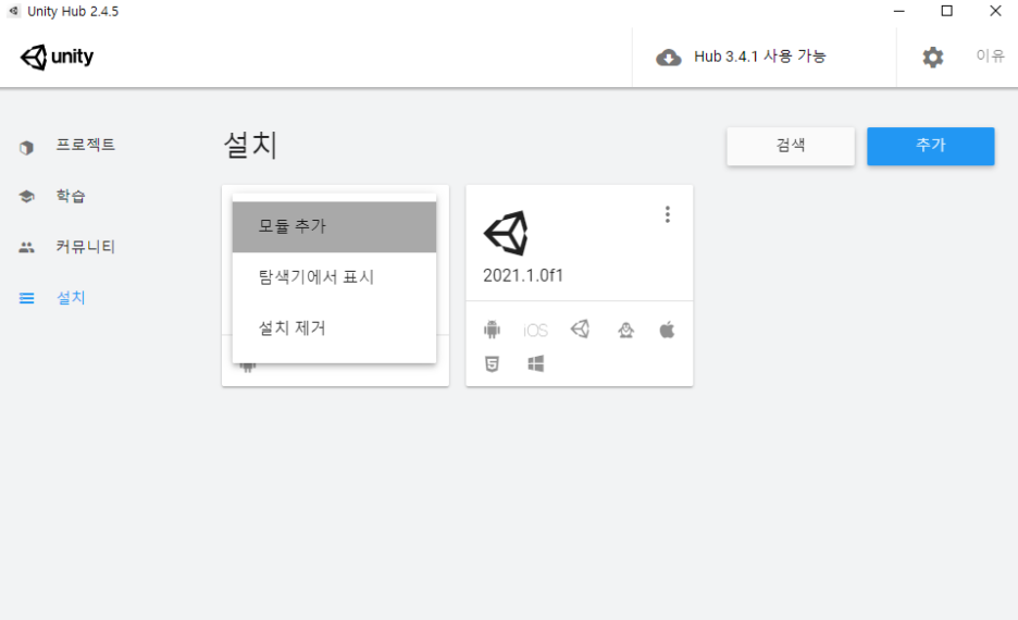 적용이 안되어있으면 유니티 허브에서 모듈 추가를 통해 다운받을 수 있다