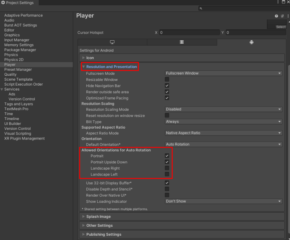 세로모드로 할 게임은 Landscape에 해당하는 옵션만 체크를 풀어준다.