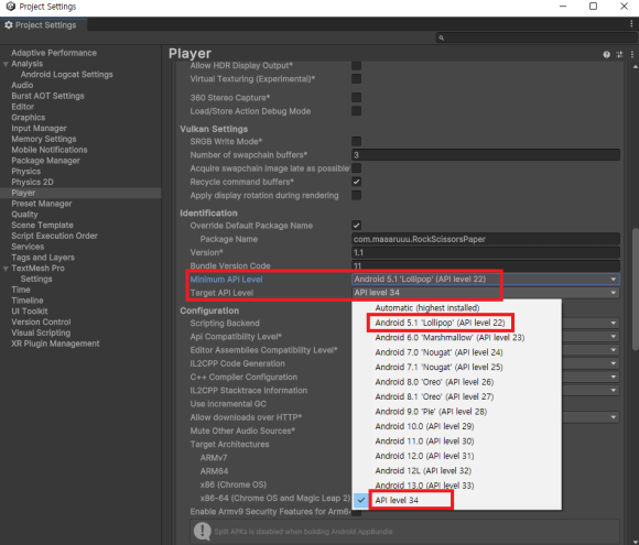 File → Bulid Settings → Player Settings에 들어가면 Other Settings가 있다